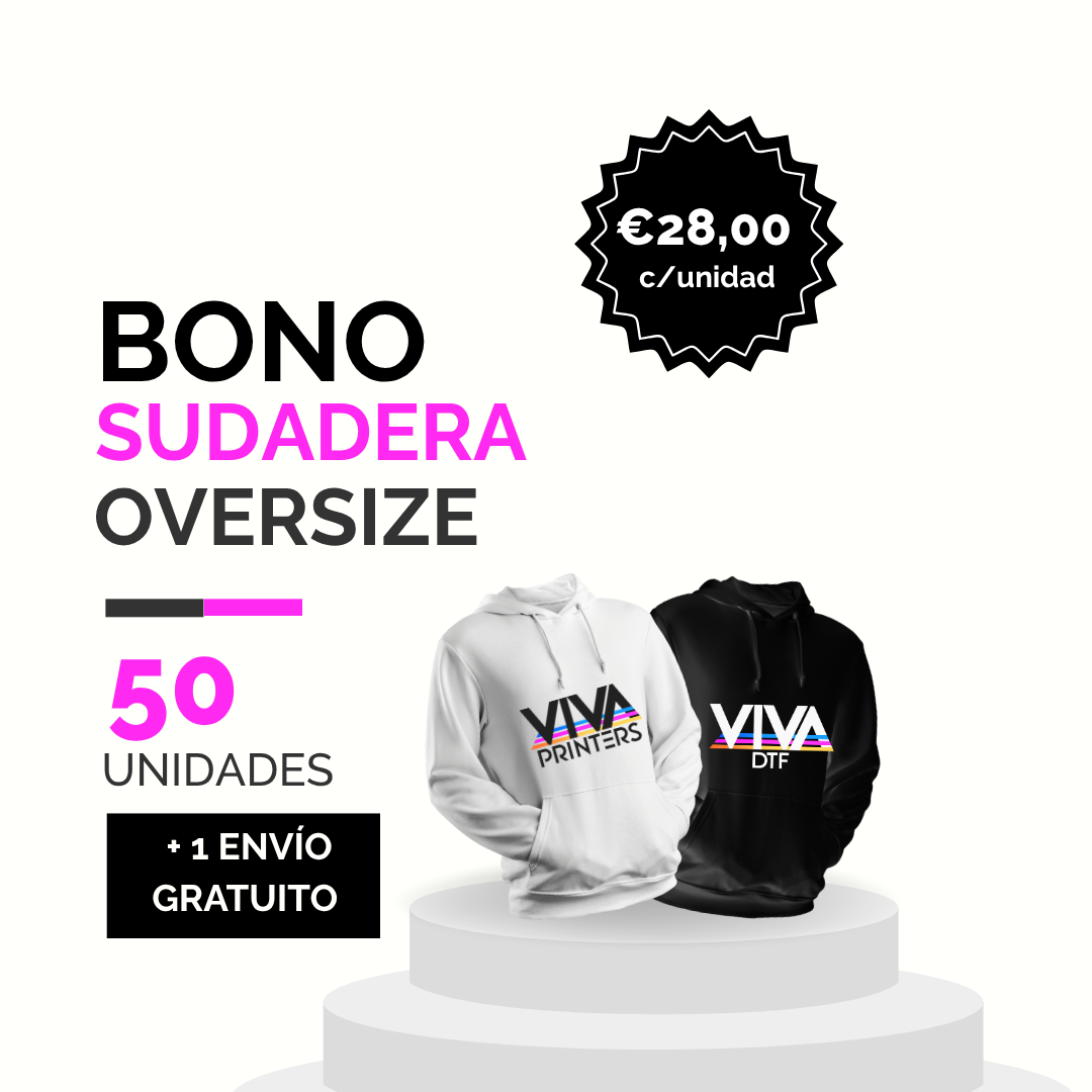 El Bono de la sudadera oversize 50 unidades es la elección ideal para aquellos que buscan maximizar la flexibilidad y eficiencia en la personalización textil. Muy fácil, puedes comprar tu bono ahora y pedir todas las sudaderas oversize de golpe o puedes ir realizando diferentes pedidos hasta agotar poco a poco las unidades de sudaderas oversize compradas. La sudadera unisex oversize con capucha, 80% algodón y un 20% poliéster, es perfecta para eventos y personalización, disponible en 2 colores (negro y blanco) y tallas de S a XXL. Gramaje 300g por m².