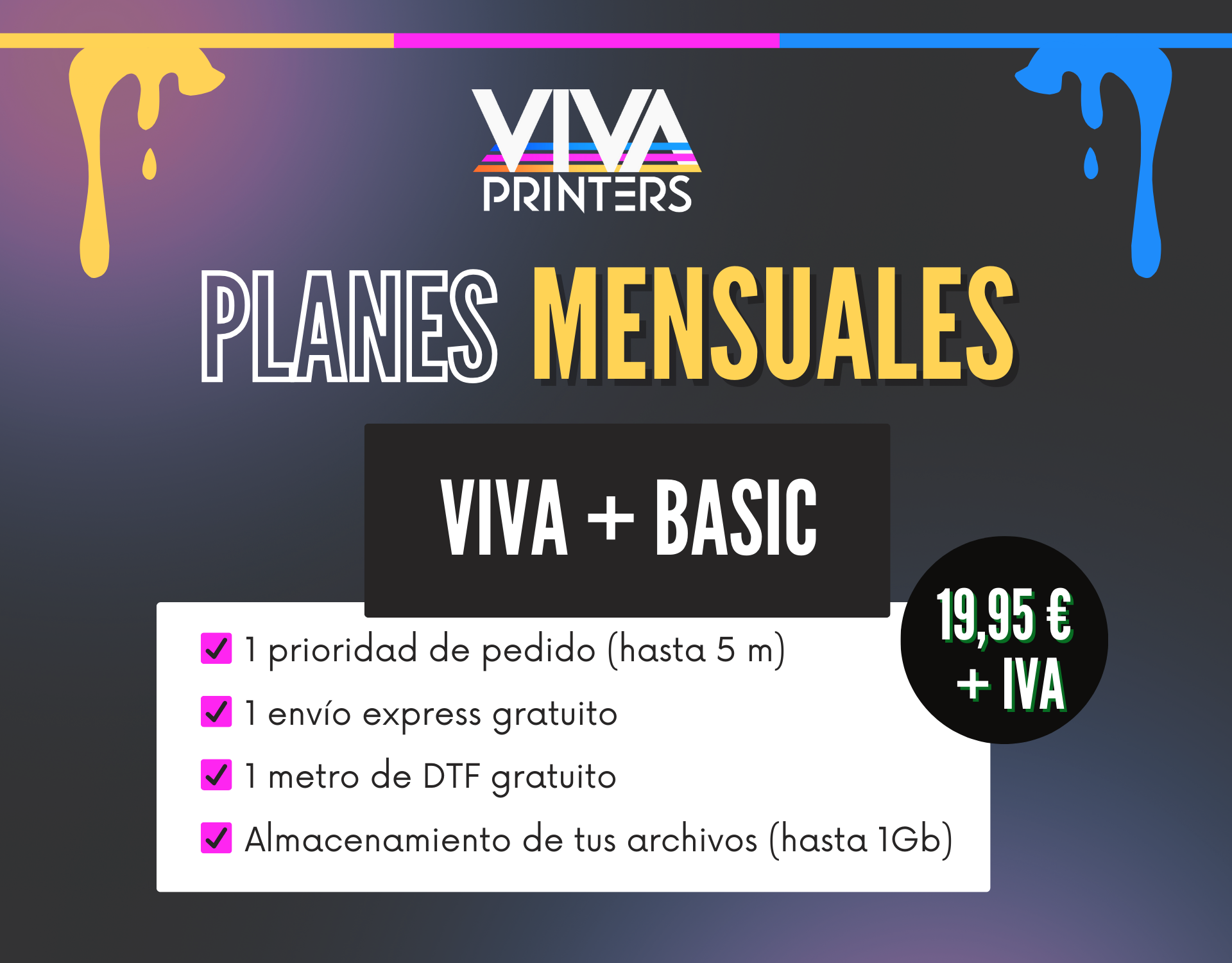 Con Viva + Basic, disfrutarás de una suscripción mensual que te ofrece una serie de beneficios exclusivos para facilitar tu experiencia con nuestros servicios. Por solo 19,95€ al mes, obtienes: